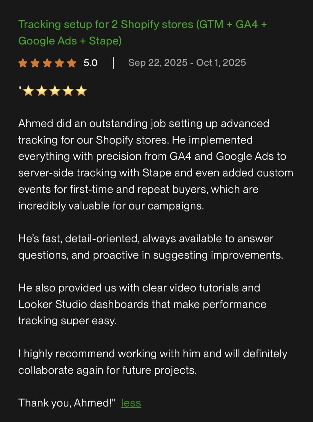 Full migrations, event tracking, and Looker Studio dashboards that business owners can actually read.